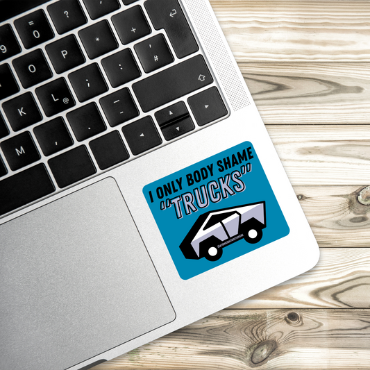 I Only Body Shame “Trucks” Sticker | Cybertruck Parody Vinyl Decal | Funny Anti-Elon Sticker | Water-Resistant | 3" x 3"